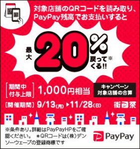 QRコード決済のPayPay では、「街のお店を応援!20%相当(最大1,000円 )戻ってくるキャンペーンを実施中